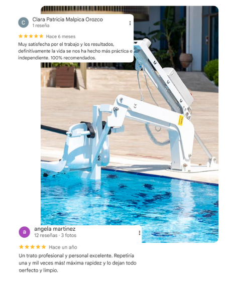 La capacidad varía según el modelo y el tipo de brazo. En la visita te indicamos la carga admisible del elevador que mejor encaja con tu uso y tu piscina para que tomes la decisión con tranquilidad.