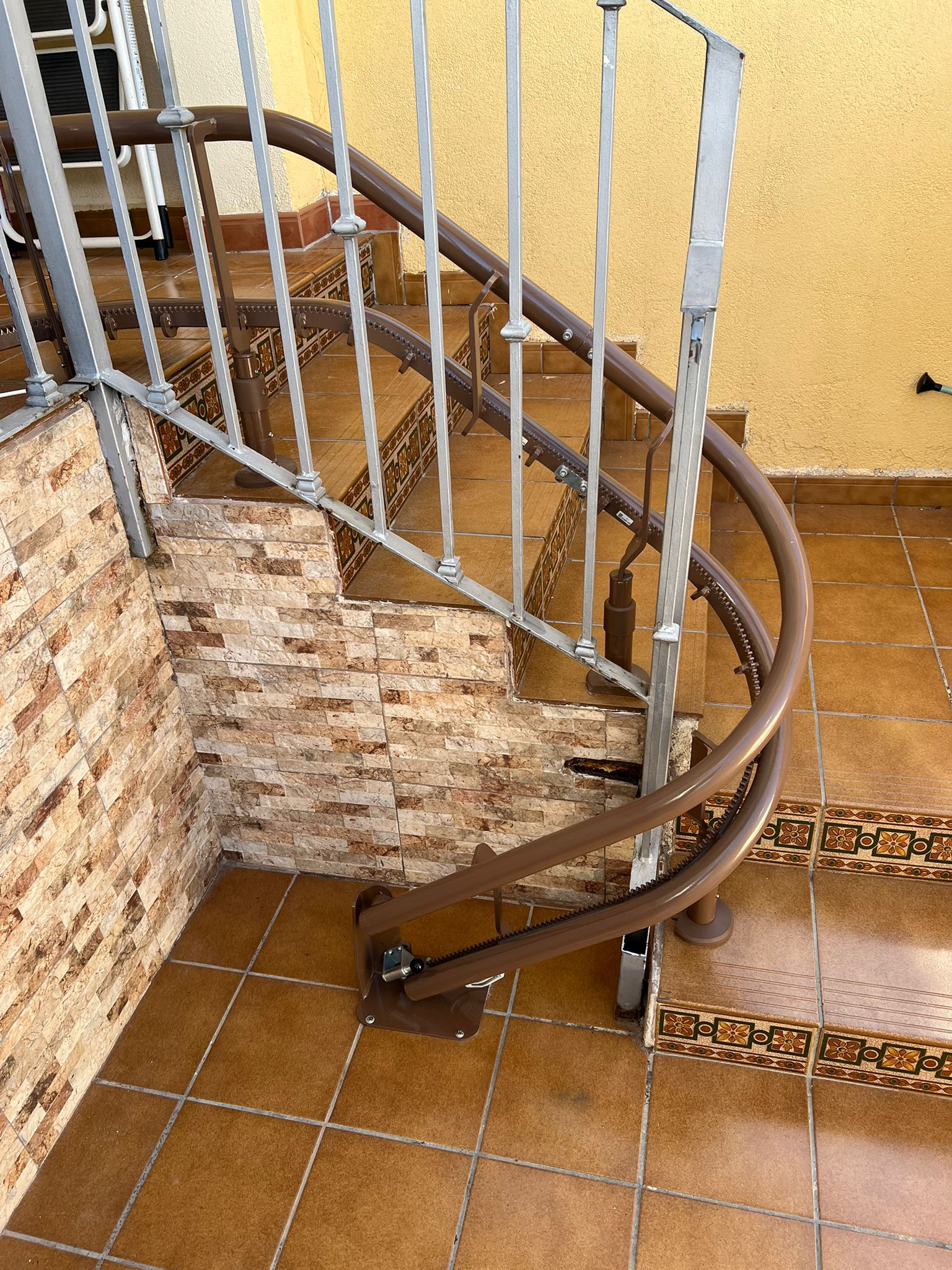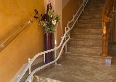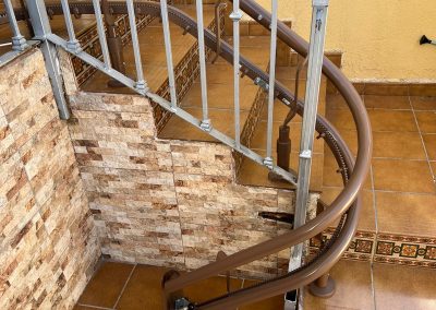 Cuando la escalera tiene curvas o cambios de pendiente, fabricamos un raíl a medida que sigue el trazado exacto.