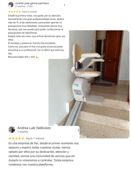 Juan es una persona muy atenta y me ayudó a elegir la mejor opción para mis padres, nos instaló una salva escaleras curva. Muy recomendable el servicio